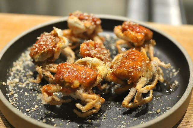 K.F.C. - here the acronym stands for Korean fried crab... and in this case Japanese river crabs (沢蟹). Nice and crunchy, with the expected spicy kick on top of the sweet coating, plus a little citrus.