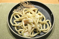 Udon, clams, garlic leek - another one of my absolute favorites here is the udon, which comes from a guy in Fukuoka (福岡) using just flour, salt, and water. I get such an incredible, satisfying feeling as I bite into them.