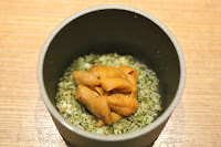 Uni, fresh nori, aonori panko - there is a pile of panko (パン粉) at the bottom that's been tossed with aonori (青海苔), plus some fresh nori (生海苔), and a little bit of yuzu oil. Mixing things up gave some crunch to the otherwise creamy sea urchin, and also added interesting fragrance from both the seaweed and the yuzu.