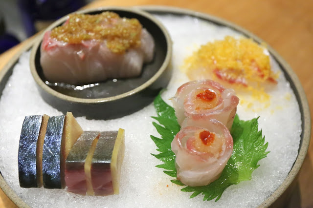 Saba mackerel sashimi, persimmon, smoke - the usual, and love the fattiness of the fish paired with the sweet persimmon.