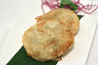 Deep fried crab meat and mushrooms dumplings (酥炸蟹肉香菇盒) - deep-fried is always good... The crispy shell is softened by the sauce that one ladles on top.