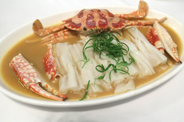 Steamed fresh flowery crab with aged ShaoXing Wine and fragrant chicken oil and flat rice noodle (雞油花雕蒸大花蟹配陳村粉) - I suggested that we pay the supplement for this option because, after all, THIS is the signature dish of the restaurant. Before the dish showed up, I was wondering if they would really serve us a whole flower crab, but they did!