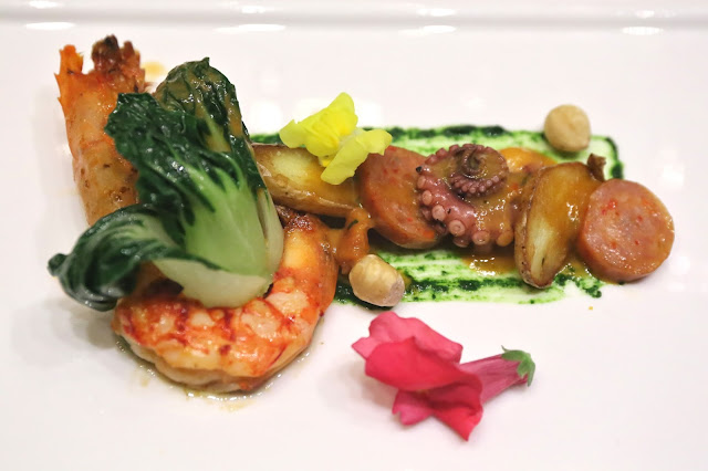 Red Prawn: pan fried Spain Palamos red prawn, slow cooked octopus, chorizo and ratte potatoes, sauce salsa verde - the Palamós prawns are among my favorites, and this one was delicious. The octopus was very tender, and the chorizo gave the dish a very Mediterranean feel. Of course I waste no time in sucking out the contents of the prawn head which, while providing me with plenty of umami, kinda killed my palate for the red wines...