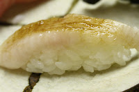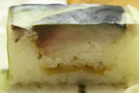 Mackerel (鯖) - done in box sushi (箱寿司) style, with a thin piece of shiroita kelp (白板昆布).