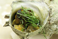 Oyster (牡蠣) - from Akkeshi (厚岸) in Hokkaido. Served with scallion sprouts (芽ねぎ).