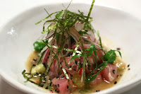 Sustainable blue fin tuna, cucumber, ponzu-sesame sauce - I normally don't touch blue fin tuna as it's not sustainable, but here it's labeled "sustainable"... so I figured what the heck. Came with avocado, orange, red onions, and sesame. Unfortunately the sauce was too salty for me.