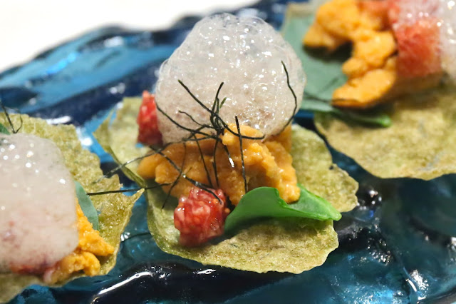 Sea urchin, fig, nori cracker, oyster leaf, ponzu - this was one of the dishes I had read about, so expectations were high. I could smell the ponzu (ポン酢) when the dish arrived. I ate this in one bite, so I didn't pay too much attention to the flavors of the individual ingredients... kinda like Pigsy (豬八戒) in Journey to the West (西遊記) when he swallowed peaches whole and didn't really know what they tasted like. Anyway, my mouthful tasted pretty good, as all the ingredients seemed to meld together, but I wasn't particularly blown away as I had expected. Maybe I need another bite...