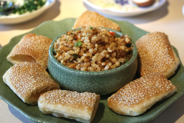 Sautéed minced chicken with pine nuts served with sesame pastry pockets (崧子雞米配叉子燒餅) - an old favorite of the gang. Not as delicious as it used to be, but still pretty decent. I tried not to overstuff the pockets...