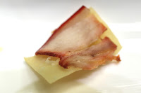 Beijing smoked pork (北京燻肉) - a very thin slice of flavorful pork, served on top of a thin wafer of crispy fried dough.