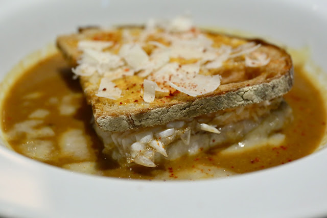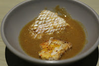 Daily fish "bouillabaisse" - this bouillabaisse looks pretty good, with a thin slice of sourdough bread on top, with some cheese shavings and a sprinkle of piment d'espelette. The fish below the sourdough? Surprisingly, it was tilefish. Or amadai (甘鯛) for those of you in the know.