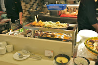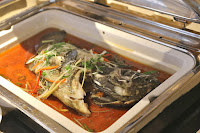 I happened to be standing by when the kitchen brought out a whole steamed garoupa... and I watched as the first girl immediately used the spoon to dig out one of the cheeks - commonly seen as the best part of the fish - before taking a piece of the body. Then the guy in front of me - who cut in line - proceeded to remove about 2/3 of the fish for himself... I took only a small part of the collar and the surrounding flesh. Although I found it to be ever-so-slightly overcooked, the fish was still very delicious, and the execution impressive for a buffet.