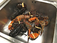 So Hello Kitty dutifully took a knife to them... and decided to stop at three. We figured we'd compare the taste of the lobsters - between the ones steamed alive and the ones that were killed by splitting their heads.