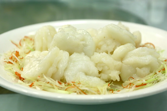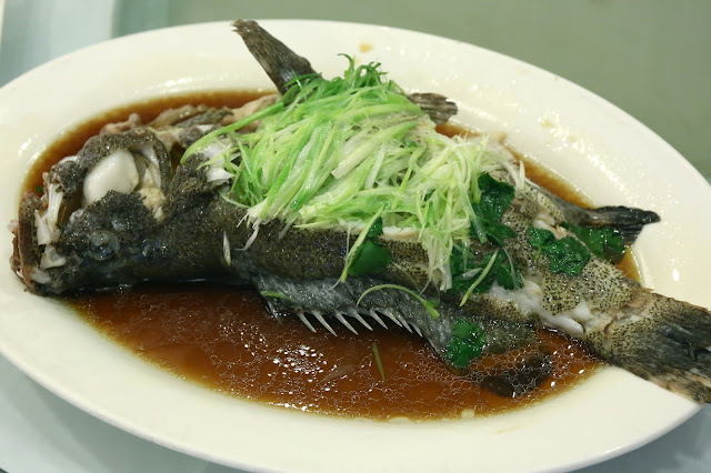 Steamed humpback grouper (清蒸海老鼠斑) - very, very good... and a nice change from the sole that we always seem to get here.