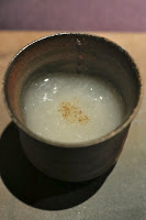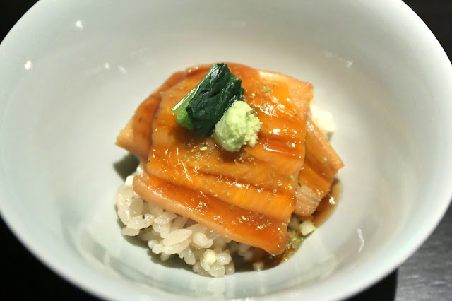 Simmered anago sea eel with Arima sanshou flavored steam rice ("煮穴子"と "有馬山椒"風味の御飯) - the simmered conger eel was incredibly soft... almost but not quite to the point of being mushy. Very yum. The sansho (山椒) pepper flavors were mild but still present.