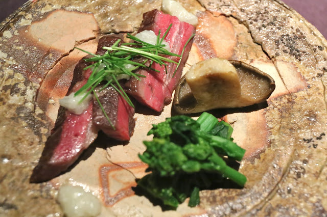 Charcoal grilled pure breed Iberico pork "Premium Pluma" ("準血のイベリコ豚"貴重な "プルーマ"だけを使った 蜂蜜醤油焼き) - I was kinda surprised to see how dark the slices of feather loin (pluma) were, but they were sooooo tasty! Such beautiful execution in terms of grilling. Instead of salt, the chef has chosen to use on the side a mushy mix of shiokoji (塩麹), onions, and turnip to season the dish, and that was pretty interesting. Garnished with daikoku shimeji (大黒しめじ) mushroom.