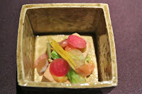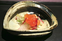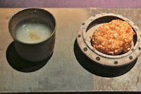 Cold kegani crab egg custard with grated fresh apple vinegar (毛蟹の冷製茶碗蒸し すりおろし林檎の赤酢と共に) - the only savory dish I've had before, on my last visit. Always love Japanese horse hair crab, and the apple added some sweetness to the dish.