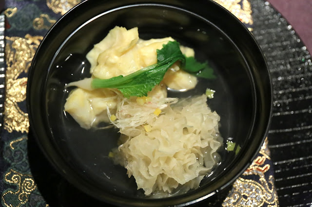 Scallop and yuba dumpling in ichibandashi soup (帆立とゆばの真丈椀) - I always love the light, clear ichibandashi (一番出汁), and I made sure to start with a sip. The dumpling (団子) was made with chunks of scallop along with tofu skin (ゆば) and white fish. Interesting that the chef chose to use the white snow fungus (雪耳). All very clean and delicate flavors.