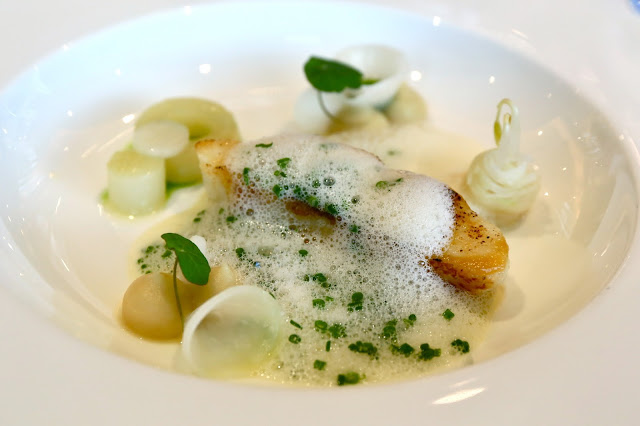 Turbot, kohlrabi, chives, dashi - it's always interesting to see that European chefs' penchant for using kohlrabi, and to me it's a crunchier version of radish or turnip. Here we've got a pan-fried turbot - which was, unfortunately, just a tad overcooked - served with a white wine butter sauce infused with dashi (出汁) and chives. You've got several different textures of kohlrabi, ranging from raw to cooked to mash. While I thought the dish was pretty tasty, it did seem a little over-seasoned.