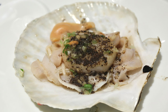 Pan-fried Japanese scallop with black truffle lemon sauce (岩手鮮活元貝香煎配黑松露香檸汁) - this, however, is the more interesting preparation. Plenty of black truffle paste, and the acidity from the lemon sauce stimulated the appetite further. Wonderful dish.