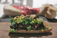 The baguette was charcoal grilled, with bone marrow mayonnaise, pickled mushrooms (trompette de la mort?), herbs, flowers, and deep-fried shallots with fermented mustard seeds on top. There's a lot of stuff on this here baguette, but the combination worked to balance out the fatty beef.