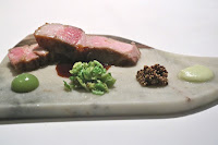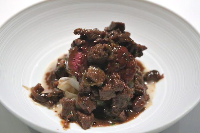 Venison: Welsh, Rhug Estate, organic, choclate, parsnip - venison loin came with a chocolate leaf on top, along with freeze-dried blueberries. Then venison ragoût was ladled on top of it all, melting the chocolate leaf so that it mixed with the sauce.