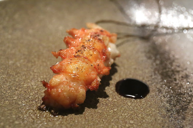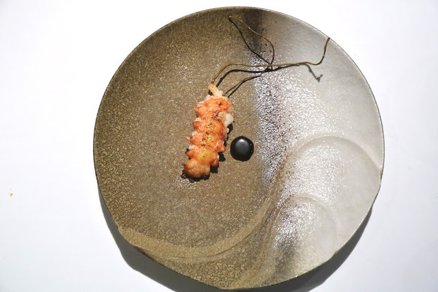 The langoustines - which arrive live - are seared and sprayed with a sake (酒) dashi (出汁) vinegar and sprinkled with dark roasted kombu (昆布) powder. Served with langoustine reduction on the side. Absolutely beautiful. The flavors of that langoustine... just WOW! So fresh, so sweet, and so full of the flavors of the sea.