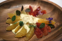 What arrived was an array of Japanese citrus fruits, with blood orange, yuzu (柚子), dekopon (デコポン), mikan (蜜柑), and grapefruit. Frozen pulp was spooned into the middle of the plate and covered with crème Anglaise. Garnished with basil and mint. Thankfully, this was a pretty light and refreshing finish.