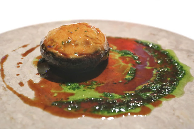 Stuffed shiitake mushroom with duck confit, foie gras, and chicken mousse in honey soya duck jus - these were giant shiitake mushrooms, and there was a lot going on here.