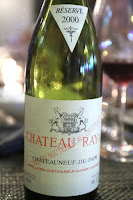 2000 Rayas - first pour was disappointingly dirty and chalky. Turns out it was a dirty glass. Second pour into a new glass showed more animal notes. After 2½ hours it finally opened up, showing good fruit and a little violet, along with a little sharp alcohol. Pretty good, but not nearly as stunning as the ex-domaine bottle I drank 4 weeks ago.