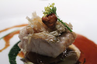 Amadai: chicken wing, girolle - next round of utensils saw all of us with the same knife… which again meant that this was something extra before our individual mains. Uwe's amadai (甘鯛) is pretty amazing with those crispy scales that are incredibly yummy. Now you've got a boned chicken wing sitting at the bottom, lightly flavored with cumin, truffle sauce and mash. A single girolle sits on top of it all.