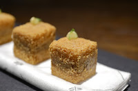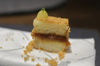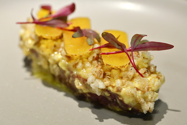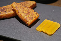 Sweet potato, "bottarga", buckwheat (番薯, "烏魚子", 蕎麥) - here we've got a chunk of sweet potato that's been covered with buckwheat crispies and a sauce made with salty egg yolk.