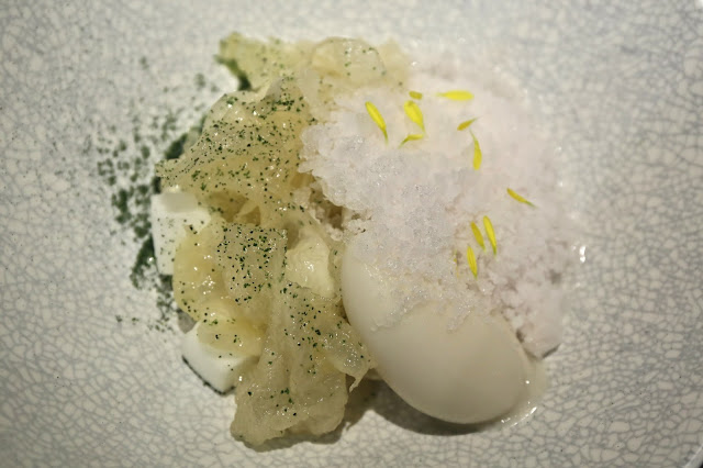 White fungus, soursop, bergamot (白木耳, 釋迦, 佛手柑) - a wonderful dessert to finish the meal, but there seems to be some translation errors here. The dish was introduced to us in Chinese, so we were told that the sorbet was made with 釋迦 - which happens to be in season. But 釋迦 is custard apple while soursop is a completely different fruit altogether. Same thing with the granité, which was supposed to have been made with lemongrass and 佛手柑... the latter of which is actually Buddha's hand since bergamot is something completely different. There was also snow fungus, marshmallows made with Buddha's hand, custard apple pulp, star fruit, aiyu (愛玉) jelly. I was told that the green powder on top was seaweed, since I had a hard time identifying it against the incredible fragrance of citrus.