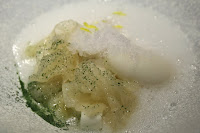 The restaurant's trying to be cool by presenting a menu listing only the main ingredients - in a manner reminiscent of the grid from Eleven Madison Park. The menu, which comes in either English or Chinese depending on one's seat at the table, is tucked away in a drawer underneath the table top at each seat - along with all of the cutlery and the napkin. The only thing, though, is that I was too dim-witted to figure out why any of the three ingredients for each dish appear in their respective columns.This whipped butter with buckwheat came with our bread. I'm generally not a big fan of butter that is close to being a foam, but this was alright.