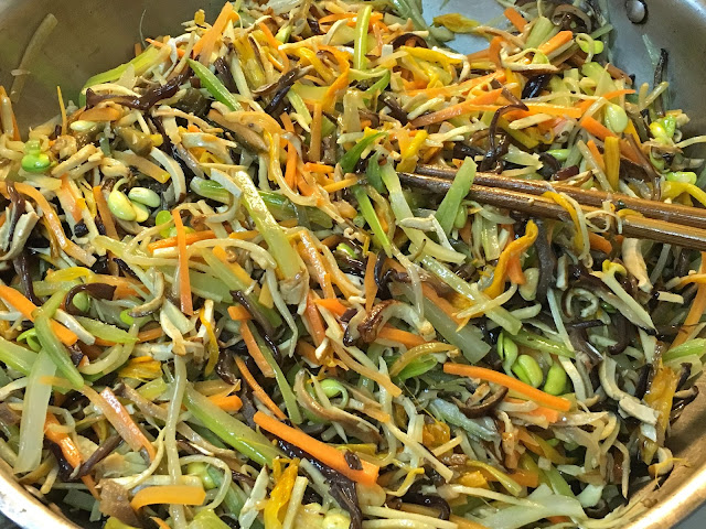 My focus, of course, was squarely on the dishes that mom prepared. And her contribution always starts with her version of the perfect ten (十全十美). It's a labor-intensive vegetarian dish that is prepared over the space of at least two days, and I wrote about it a few years ago. Mom almost always serves it cold so that some of the ingredients could retain their crunch. This year, though, she decided to use only nine ingredients instead of ten. Hair moss (髮菜) has become increasingly expensive over the years, and she would need to use a pretty big amount for it to be noticeable in the final mix - something she felt wasn't exactly worthwhile this year. Of course, not using hair moss is also more environmentally friendly, as its harvesting promotes desertification in the parts of China where it is found.