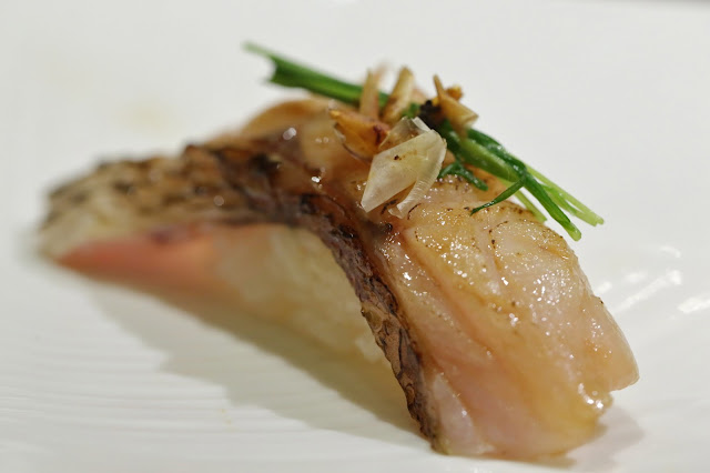 Rosy seabass (赤鯥) - torched, served with spring onions and crispy scales.
