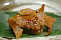 Next came a little snack, featuring the leftover bits from the halfbeak we had earlier. My friends got the deep-fried halfbeak bones, I had halfbeak skin wrapped around a stick and torched.