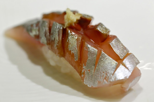 Gizzard shad (小鰭) - served with a piece of perilla leaf under the neta. Interestingly this was surprisingly salty, almost like salted plum (梅).