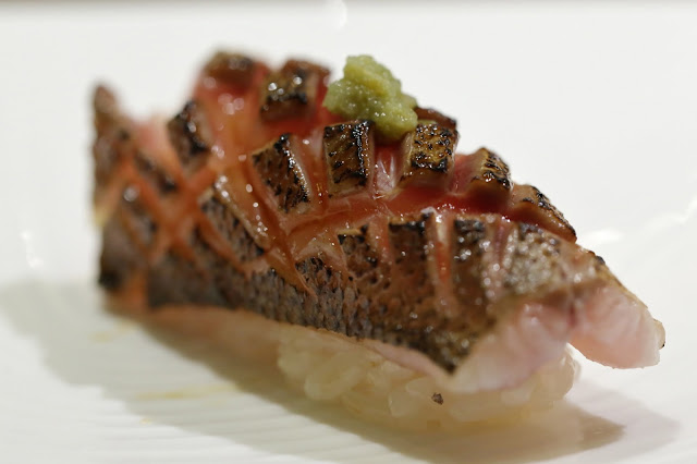 Barracuda (魳) - nicely scored. Lightly torched to impart a smoky fragrance and heavier flavors. Topped with a dab of yuzukosho (柚子胡椒). Very nice.