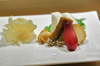 The chef then brought out the plate for serving sushi, along with their selection of homemade pickles...