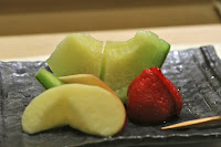Finally, we have some seasonal Japanese fruits to finish off. The musk melon (マスクメロン) from Shizuoka (静岡県) was, naturally, very ripe and very sweet. The same could be said of the strawberry from Fukuoka (福岡県). the apple from Aomori (青森県) was very, very good, too.