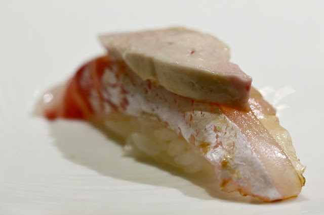 Wild red seabream (天然真鯛) - served with a piece of its own liver on top. Yum.