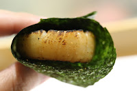 Grilled scallop (帆立貝), wrapped in toasted seaweed.