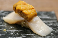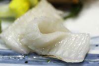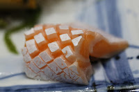 Salmon handroll - beside salmon, there were also little bits of tempura dough to provide some crunch, and spicy mayo. Actually reminds me of those spicy tuna rolls that you find in US neighborhood sushi joints... Interesting that the cook told us to "eat it while it's hot" when the rice itself was only lukewarm and the salmon was cold...