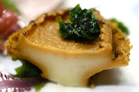 First up was this plate. Our waitress plopped it down in front of us and walked away. I tried to ask what it was that we were eating, but I couldn't get an answer. The cook came out, and he didn't seem to understand my question of "what are these?" Maybe he thought I was a total idiot... since I couldn't even recognize what was obviously a giant scallop in front of me.