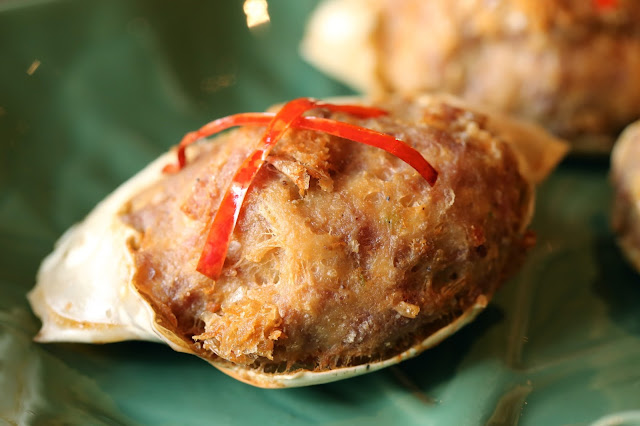Pu jah (ปูจ๋า) - little crab shells stuffed with a blend of crabmeat and pork, then steamed.
