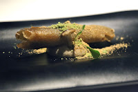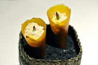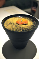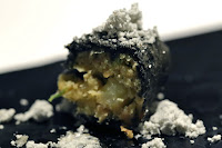 Yogurt explosion - another signature nibble that I had in Hong Kong. Spherification of yogurt with black cumin seeds. Yum.