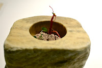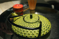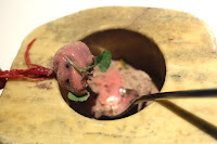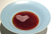 The teapot contains hot tomato consommé, which is then mixed with freeze-dried tomato powder with a bamboo whisk as we eat the contents of the bowl - like the Japanese tea ceremony.