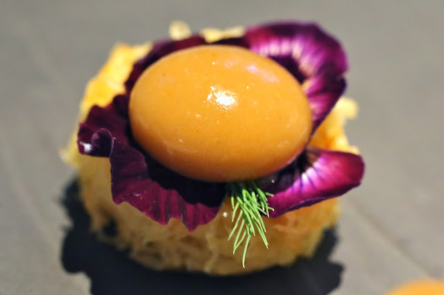 Salli boti - Gaggan's take on the popular Parsi dish of meat curry with potato sticks. The base was a deep-fried medallion of finely shredded potato, topped with another spherification with spices like black cumin seeds. A little spicy, and somehow reminds me of eating certain dry, uncooked instant noodles straight from the packet. This was delicious, but a little tough to eat in one bite due to its size. One needed to open one's mouth wide both horizontally and vertically for this to clear...