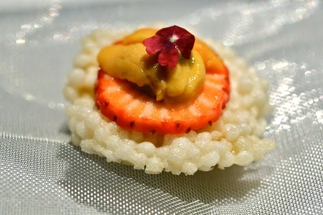 Papadum uni - I've never seen a papadum made with rice crispies, but I'm happy to try one! Hidden beneath the Hokkaido sea urchin and the strawberry was a little bit of avocado mash. This one was pretty tasty, too.
