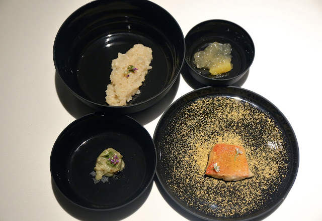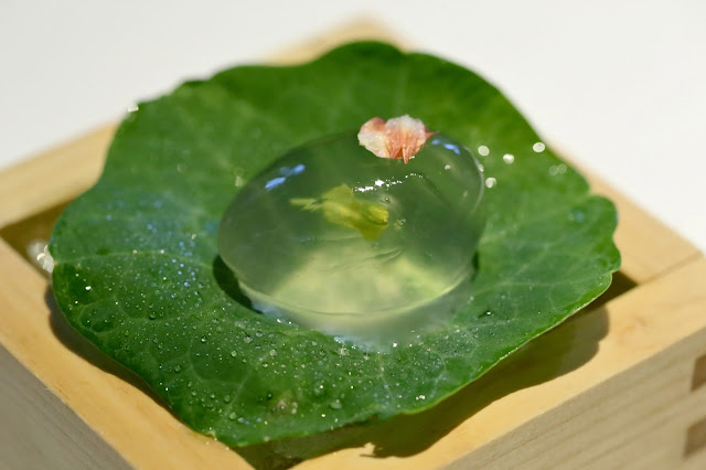 Dewdrop - I had seen pictures of this posted over the last couple of days, and was really looking forward to this beautiful dish. Made with grape juice, aloe vera, and (sansho? 山椒) flowers. I rolled it into my mouth just like a giant dewdrop, then popped the membrane with some pressure. Incredibly refreshing and clean flavors. What a great way to kick off dinner!